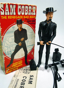 Canada had some very interesting contributions in the Marx action figure arena. Around 1970, Canada made the boxes with the labels "made with MOD colours". For instance they produced a "Mod" Jane West. She was Dark Maroon color with pink soft vinyl and silver poly-plastic accessories. The MOD coloured Jay and Jamie West kids were molded in black with white or corral soft vinyl accessories. The MOD coloured girls were molded in royal blue verses turquoise, and had white or mint green soft vinyl accessories. The MOD Johnny West had a green color body. I have seen different shades of the green as well, and some Johnny's came with dark olive green soft vinyl accessories. Many Canadian Johnny's had (2) brown stars with accessory packs. It appears obvious Marx used accessory molds from the U.S. Sheriff Garrett for other figures using this accessory mold. I am sure I have not seen all of the Canadian figure / accessory colors and or variations verses U.S. made figures. Next lets cover the Canadian exclusives. In Canada, their Sheriff was Sheriff Thomas Goode, not Sheriff Garrett. Sheriff Goode was essentially a Sam Cobra body molded in white, with a blonde haired Johnny West head. Sheriff Goode had black or silver Sam Cobra type accessories, silver being the most HTF. Sheriff Goode was also given gold or silver Stars, (stickers), and had two box variations as far as I am aware. The 1974 version "Best of the West" graphics, or a newer issue with a blue / orange box produced around 1975. Sheriff Goode is quite HTF MIB. A second HTF Canadian Marx figure is Dangerous Dan. Dan had a light blue molded body with a Maddox head. The interesting part of this figure is his hair and beard. Dangerous Dan had a fully flocked fuzzy beard and head of hair! It was similar to the infamous G.I. Joe fuzzy heads. I have also found several blue body figures with Cobra heads and one with a Sir Gordon the Gold Knight head. I do not know why some of these Dangerous Dan's had the alternate heads, other than the molds not being available in Canada at times when needed. Dangerous Dan had the same accessories as the U.S. Sheriff Garrett, minus the stars. Box packaging is also extremely hard to find. The box features a modified picture of Johnny West with a hand colored beard! I have seen two versions of boxes; one has the MOD label while the other has French text in that same area. In both cases, it was a "campfire" modified Johnny box. A third unique figure to Canada is Jimmy West. Jimmy basically is a Chocolate mold colored Johnny West type body, with either a Zeb Zachary or Captain Maddox head. I have seen them with either head style, I am not aware of either one being more common than the other is. Like the Flocked Dangerous Dan, the collector preference is the Zeb head for Jimmy. I also have seen a Zeb style head version with brown hair. This appears to be quite unusual for Jimmy. I am not sure why, but I do know it is a factory head. Jimmy came with HTF bronze soft vinyl and silver hard poly-plastic Johnny West type accessories. Again, he might have had other common color styles; I have not seen enough to draw any lines here. I have also seen Jimmy like some green Johnny's wearing dark olive green colored vinyl accessories as well. Horses and animals were very similar to the US. I have seen thunderbolts in a darker tan color and Comanches in palomino. U.S. seems to be the opposite. I have also seen Canadian tack in a light caramel color as opposed to the standard brown color. I have heard from Canadian collectors / dealers that various odd colors of Buckskins exist as well, but I have not seen them myself to draw any conclusions. From time to time I find and see new Canadian items. They interest me like JWA items and odd test shot colored figures and accessories. Much more detail can be found in our Canadian Module! Check it out!