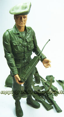 Two Combat Soldiers were also produced, Sgt. Baker and Sgt. Starr. The solders were molded in green poly-plastic with accessories all molded in green soft vinyl. Their bodies were molded differently unlike the Rat Patrol set which had the same mold style. The accessory molds were identical to the Rat Patrol figures. Mexican issues were molded in a darker green with black poly-plastic accessories. I have both original U.S. versions, and a Mexican version of Sgt. Baker shown for comparison. The Sgt. Starr is the most HTF in my opinion. I have never seen any military figures carded.