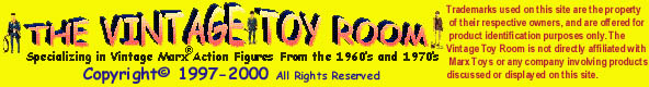 Note: Copyright© 1997-1998 The Marx Toy Room has changed. all previous Marx Toy Room references are hereby transferred to The Vintage Toy Room. Please use all references and information based on The Vintage Toy Room as of this page. Both The Marx Toy Room and The Vintage Toy Room are or were owned by Tom Heaton.