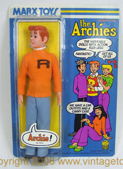 In 1975, Marx also produced a series tailored from the popular characters called the "Archies." These included four figures sold on blister cards called Archie, Jughead, Betty, and Veronica. They were all fully clothed, and the girls had rooted hair. Early Marx retail catalogues show the figures with plastic molded heads, I am not sure if they were ever mass-produced that way. I have only seen the rooted hair versions. They were made in a doll like fashion much like "Barbie" as opposed to the Marx poly-plastic style of many of their other figures. They were produced in Marx Hong Kong per package labeling and stock numbers. This set also had a few accessories. The first is a vinyl carrying case. The case was designed for holding the dolls and or clothing accessories. Lastly, an Archie jalopy was produced. Although it was designed for the four figures, they do not sit in the car easily. The figures themselves were very limited in the articulation category. Archie characters are quite collectible today. Being they were produced late in the game by Marx, I am sure quantities are limited out there.