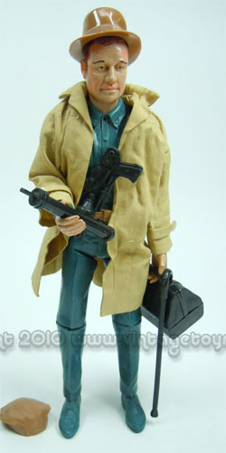 1966 also brought a pair of secret agent action figures. "Mike Hazard, Double Agent" and "The Girl from U.N.C.L.E." Both characters possessed lots of spy gear. Mike had everything from disguises to weapons including pistols, exploding bags, tear gas pen, a working rocket launcher and sonar recording machines. The accessories were molded in black poly-plastic and tan or flesh colored soft vinyl. Mike is the only solid poly-plastic Marx 12" action figure (other than Military figures.), to come with Clothing. Mike came with a trench coat with belt and buckle, with secret pockets inside to hold some of his accessories. Mike is one of the accessory leaders in the Marx figures made with a total of 62 pieces!