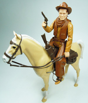 Marx realized they would need to take a different spin if they were truly going to put a dent in the action figure market. Marx went after TV show themes. One of the firsts was the figure "Daniel Boone" which was a tie in to the TV series. The head mold carried a Fess Parker look, the body was molded in caramel tan and the accessory packs were molded in chocolate brown hard poly-plastic and brown/fudge colored soft vinyl. This figure also did not have articulating legs. To my, and many other collector's knowledge they made no other versions of Daniel Boone with full articulation. To further branch into these TV themes, i.e. Wild Wild West, Gunsmoke, Bonanza etc, Marx entered into the western world. Marx went full force into production, building a 12" cowboy action figure named "Johnny West" with complete articulation. They quickly used the pre-existing Stony Smith head mold, and tooled a cowboy body to go with it. This marked the beginning to "The Best Of The West". They originally were also going to produce a figure called "James West" based on the character in "Wild Wild West", but for reasons unclear to me they pulled the idea. The "Robert Conrad" head mold and James West Body would prove to be useful in future Marx character molds, (i.e. Captain Maddox, Cowboy Kid and Jimmy West for the head, Sam Cobra and Sheriff Goode for the body). After all that tooling and mold making, surely Louis Marx Inc. could not let it go to waste. Another figure pulled from production was Jesse James also based from a TV show. Several dealers / collectors have told me it was also never produced for resale, until re-used for other character molds, (i.e. Bill Buck and Sheriff Garrett for the body, and Zeb Zachary, and Jimmy West for the head). It is interesting to add, since this book published, A new figure was developed by Noah and terri Coop at CXR. The mold was derived from a test shot jesse that surfaced on the internet. Also in 1965 along with Johnny, an Indian "Chief Cherokee", and a western range horse "Thunderbolt" were produced. Thunderbolts came complete with 15 pieces of tack, and started a Palomino colored. All horses were molded in Hard Plastic (HP). Horse packaging and accessories will be covered in more detail in the illustration guide. The "Chief", like Johnny, had full articulation. First issue figures had initial packaging with an artist drawn lithographed photo with "Action Cowboy, or Action Indian" titles. First issue Chief Cherokees and Johnny's had straight hands verses the standard curved hands Marx went to after a short production cycle. Also quickly changed was the word "Action" which was replaced by "Movable". One note on lithographed 1st issue style boxes is some versions had Registered markings while others had TM (trademark) stamps. In my opinion these boxes are basically the same but I wanted to point out that technical difference for those of you who want "every" style. Johnny West had a combination of brown soft vinyl and hard poly-plastic old west accessories. The Chief had a mixture of brown soft vinyl and hard poly-plastic Indian accessories. These figures played a key role in the accessory packs and future character molds used. Future figures I mention include the same accessory molds as Johnny and the Chief, with the exception of some figure variations and color differences. In 1966 a cowgirl was added, her name was Jane West. Jane had two head variations, the first being a tough looking cowgirl, with a more rounded head. This version was only produced a short time, about a year. Marx changed the first issue head into a more "Barbie" slender looking face and hairstyle in 1967. The first variation seems to be more desirable due to it being a little less common. Jane's initial vinyl line of female accessories were mustard colored, to eventually a cream colored soft vinyl. She had the same hard poly-plastic pieces as Johnny West. Jane's first box is known today as the 1st issue "Varga" box by many. Eventually Jane was joined by "Flame" the brown or palomino colored non-jointed "trotting" position horse. Other figures and accessories added to the Johnny West line include animals, more horses, and kids! Three other types of horses were added. These include brown or black Thunderbolt(s), brown or palomino Thundercolt (s), and a Storm Cloud Pinto (usually sold with Indian figures). I have mainly seen Storm Clouds that were brown with white spots and a black tail. Some literature shows a white w/ black spotted Pinto as well. Very few people claim to have this piece. I have seen the white molded version in pictures but not in my actual hands. I did run across another unusual Storm Cloud version. It was reddish or chestnut horse with white spots, but many believe it to be unintentional by Marx. This version of Storm Cloud appears to be a horse intended for the Covered Wagon or Bravo the Knight's horse and perhaps used in error. A final large horse added was Buckskin. He was available in brown or palomino. This horse had fixed legs but articulation in the head and neck. It was further used in another series, (The Vikings and MOD Knights) that I will be discussing later. Buckskins are quite collectible today. All large-scale horses had either brown or black tack, the black being the most HTF. Marx also added kids to the Western scene. These include two boys Jay and Jamie west, two girls Josie and Janice West, and a Pancho pony for the kids. The boys each had the same male cowkid accessory packs made with all soft fudge vinyl pieces. The girls likewise had the same girl cowkid accessory packs molded all in cream soft vinyl. The Pancho ponies were made for the kids and came in palomino or chestnut color. They had a different set of tack than the large horses with only eight pieces, which were in fudge brown black or light caramel molded colors. Also added were a wild buffalo made of HP, two dogs Flick (shepherd) and Flack (Setter) both made of (HP), brown or palomino Thundercolts, a 
