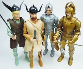 1970 also brought out changes and additions to the Noble Knights. Box styling changes were made by Quaker Oats to correspond to the mighty Vikings box artwork. Again this is referred to as MOD box styling. The success of the Knights led to the creation of the Mighty Vikings. There were two: 'Odin The Viking Chieftain" and "Brave Erik The Viking Son". Odin was molded in caramel tan and had cream soft vinyl accessories, and Erik was molded in light mint green with brown soft vinyl accessories. Both Vikings had the same black colored poly-plastic accessories. The Vikings came with two buckskin horses with wheels and special Viking tack! Odin came with a brown Buckskin and Erik came with the palomino version. To further finish of the interesting series Marx added a Castle Playset. It was full size for the 12" figures, ready to have your knights' guard and protect the fortress against the attack by the Mighty Vikings Erik and Odin. This set is a popular accessory today. The Vikings are in high demand due to the short production run. The Knights, who had a (2) year head start, are obviously in greater supply. MOD Packaging of the Post 1970 figures (Both Knights and Vikings) is HTF due to their flimsy nature. I encourage the knights for collecting. I have been emailed by many people stating the history and detail of the Knights and Vikings is extraordinary.