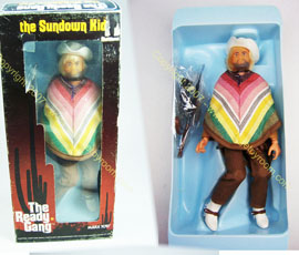 The Ready Gang was yet another product line by Marx in the mid 1970's to compete in the action figure world. Figures developed include Trooper Gibson, Ringo and Sundown Kid, and lastly a rare low produced (if ever) figure Black Hawk Indian. The figures had a mix of highly detailed and painted accessories made of HP, and soft vinyl. The figures themselves were about 9" tall, nude style similar to the "Lone Ranger" figures, with rooted hair, detailed cloth clothing and removable boots with chrome spurs. Trooper Gibson was an ex-Calvary soldier. I say "ex" because he is considered a gang member. I don't believe him to be a Sheriff like many think judging by pictures on packaging. Gibson had such unique weapons as a Calvary pistol, and double barrel shotgun. Ringo likewise has detail in his clothing. He had a hooded sweater with a fur vest, and a unique chrome knife with a black painted handle he came armed with. Sundown Kid had a tan-fringed outfit and a poncho draped on his body, and a neat chrome derringer to go with his accessory pack. Lastly though I never seen a Black Hawk Indian, trade books show him with white and yellow clothing, with moccasin like loose boots pulled up to nearly his knees. His weapons include detailed painted spear and tomahawk. Like any Marx western figures horses were needed to complete the picture. The horses had full jointed leg articulation and had 18 pieces of soft vinyl tack in two tone colors. The boxed horses are relatively uncommon compared to the figures. I have seen conflicting information on the horse to figure pairing. I know The Sundown Kid had Dagger a white to gray horse and Trooper Gibson was sold with Midnight a black horse with some white markings and Ringo was sold with Thunder an appaloosa brown and white horse. As far as Black Hawk his horse is plainly stated as "Indian Horse" and is shown in brown color in trade catalogues. Also shown was a covered wagon. It was basically a blend of the covered wagon and buckboard sets from the Johnny West series with some weapon trunks added. It is referred to as the Gunrunner Wagon. Horses were sold separately to go with the piece The Ready Gang set also had a playset to complete the western scene. This was the Ready Gang Action-Town. Made primarily of cardboard the three-dimensional set stretches nearly 4-feet when assembled. The town contains a jail with a cell door, a hotel with stairs and break-apart railings, a saloon with swinging doors and a bank with a HP safe with a door. The set also has detailed building fronts with signs, and a walkway with posts and roof overhangs. I gave some extra detail on The Ready Gang because I feel they are underrated. Many collectors don't even know what they are. With their color and detail I highly recommend checking them out. In my opinion it was one of Marx's last great attempts to build a new innovative action figure product in the late 1970's.