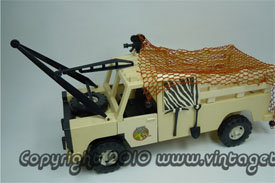 In 1975, Marx introduced another series. This series was called the "Safari Adventure Series." To start with there were three figures. Buck Hunter the leader, Sgt. Kojo the guide and Kim the photographer. All figures were molded in Marx poly-plastic, and had cloth jackets and belts. They all had felt hats, and poly-plastic accessories molded in orange. Some unique features of these figures are they are only 7" tall, and Kim actually has rooted hair. No other Marx poly-plastic figures have the rooted hair. Note "The Ready Gang" has a totally different nude hollow body style, not the solid poly-plastic mold like these. Another strange feature that characterizes these is a dial on their backs that raises and lowers their arm. Some accessories include two vehicles. The first was a pursuit truck. This was made to carry yet another accessory called the capture cage in the back. A second vehicle to the set was the jungle jeep. The jeep could pull the cage as well. It came with a camera, a radio, and a winch to hook and capture wild animals of the jungle. These animals could then be put into the capture cage. Animals were also a big piece to the Safari Adventure Series. The complete set included: tiger, rhino, gorilla, lion, crocodile, and elephant. Another accessory to the set was a lookout tower. This was designed for the safari team to spot these creatures of the jungle. The tower also came with numerous accessories such as a telescope, radio, flare gun, chainsaw, plus more to aid the team in the jungle. Lastly a final accessory worth mentioning is the tent. Though it appears in trade catalogues and box packaging it is still unknown if it actually exists. No one to my knowledge has or has seen one of these accessory pieces. It is shown as a square tent with a pair of cots and chairs, a table, lantern and other miscellaneous camping gear. I will search for the piece, though I won't be holding my breath for it.