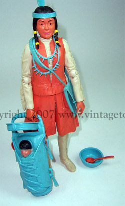 Marx also made more western type figures. These included: Chief Red Cloud Indian, Dusty Slade Cowboy, and Johnny Kolt Cowboy. To my knowledge they were never paired with horses, though some other vintage horses made by Marx would work. Some of these figures were also produced in Mexico. Mexican versions are in different colors. I have a blue Chief Red Cloud, and a White Johnny Kolt shown for reference in the illustration guide. Mexico made the accessories out of poly-plastic verses U.S. that used soft vinyl. Many of the original U.S. made caramel figures are not easily found because of breakage. Like Caramel 12" figures they break at the joints like glass. Mexican versions may be your only hope of finding them intact with some accessories.