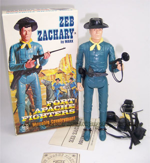 1967-1968 brought many other characters. Marx branched out further from the cowboy theme by bringing in The "Fort Apache Fighter" Series. This series brought in the Cavalry theme and more Indians (reminds me of the re-run days of F-Troop). Figures added included Captain Maddox, Zeb Zachary, the now rare and HTF Bill Buck, Geronimo, the Fighting Eagle, and lastly General Custer. Zeb Zachary and Bill Buck were produced for only a few short years. Bill Buck had a partial poly-plastic accessory pack molded in brown like that of the other Calvary figures and his soft vinyl accessories were from the Daniel Boone molds. The figure was molded in caramel tan. Zeb Zachary was a blue Calvary figure with standard black and yellow hard plastic and black soft vinyl Calvary accessories. Prices of these two pieces are on the rise today, especially a boxed Bill Buck. Zeb seems to be creeping up though judging by prices in the retail market. Bill Buck still rates the scarcest out of the two. Other Fort Apache figures included General Custer, a royal blue figure, and Captain Maddox, a steel blue figure molded like Zeb Zachary. They had the standard Calvary accessories like Zeb other than a hat variation for Custer (he had a Generals hat) and Maddox got a set of Captains bar epaulet stickers. To move down the list, the Fighting Eagle was a flesh colored Indian with the same accessory pack(s) as Chief Cherokee. Geronimo was molded in off white and came with the Chief Cherokee accessory pack(s) with the exception a 37th piece was added, a yellow headband. Two horses added were the brown and tan/palomino Comanches. These were fully jointed and are notorious today for having loose joints and don't stand and display well as a result. They included the same set of tack as the other large horses except they had a special cavalry saddle. The tack was available in black or brown. These horses also crossed over with Johnny West in some mail order combo's as well. Other playsets added included a full-scaled size of Fort Apache. The fort was made out of cardboard much like the circle ranch and as a result is tough to find today due to deterioration. The Fort contains a command post, tower, fencing, furniture and a cardboard teepee.